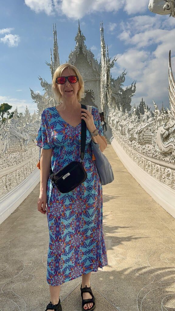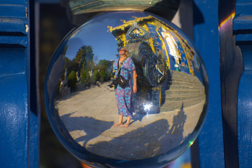 Till skillnad från de traditionella buddhistiska templen som går i guld och rött, är detta tempel målat i vitt och försett med massor av små spegelbitar, för att glimma och glittra i solen.