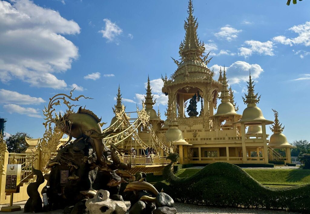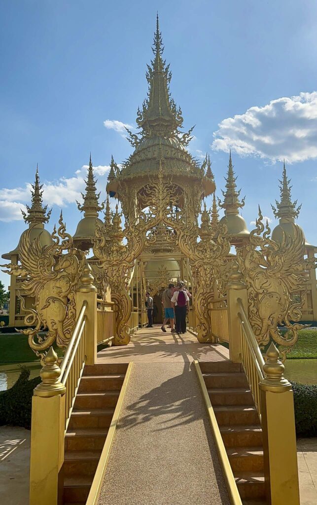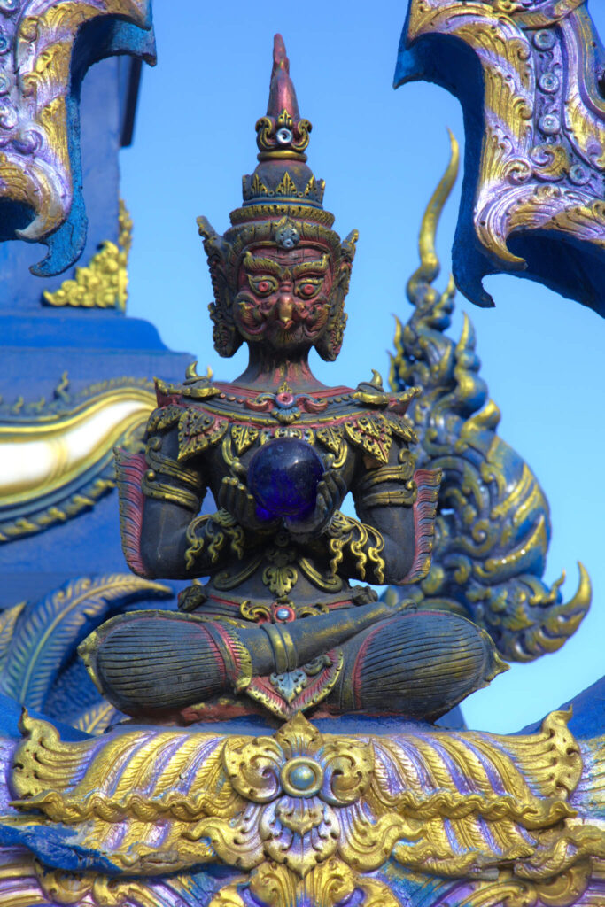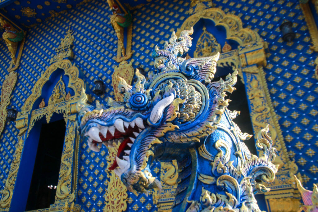 Detta tempel är från 2016 och ritades av en elev till Chalermchai Kositpipat, alltså det vita templets skapare. Här är symbolerna mer traditionellt buddhistiska, med drakar och elefanter. Det blå kompletteras med förgyllda delar som blänker i solen.