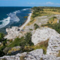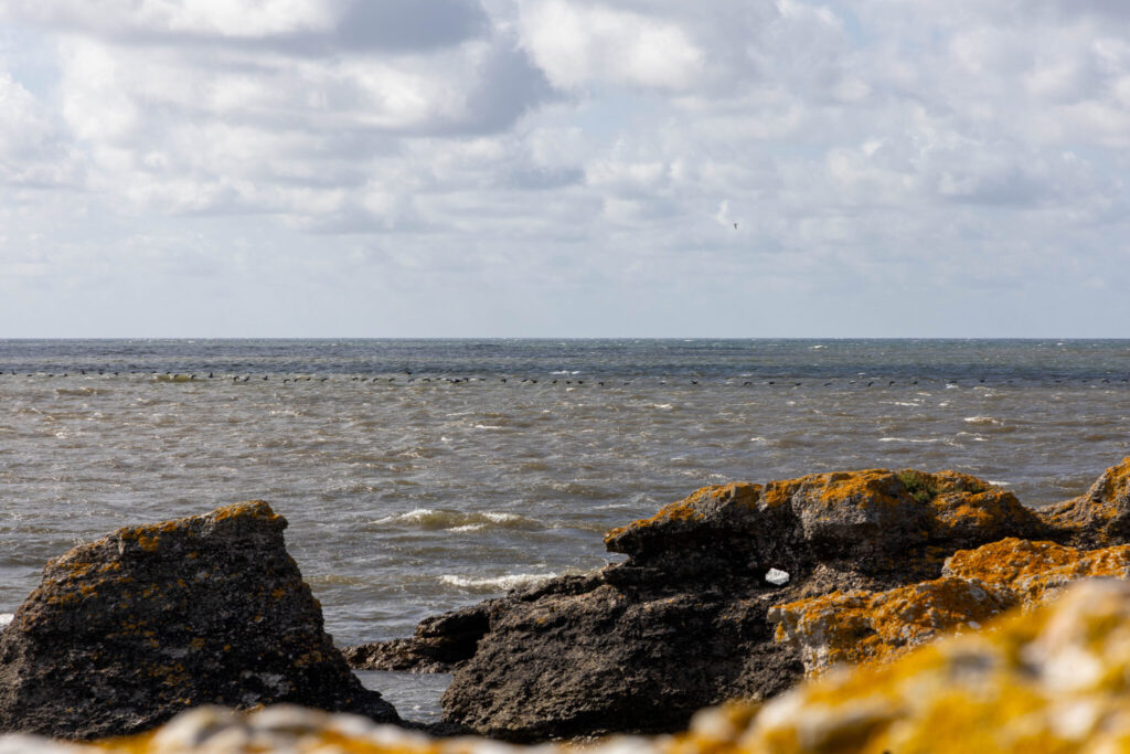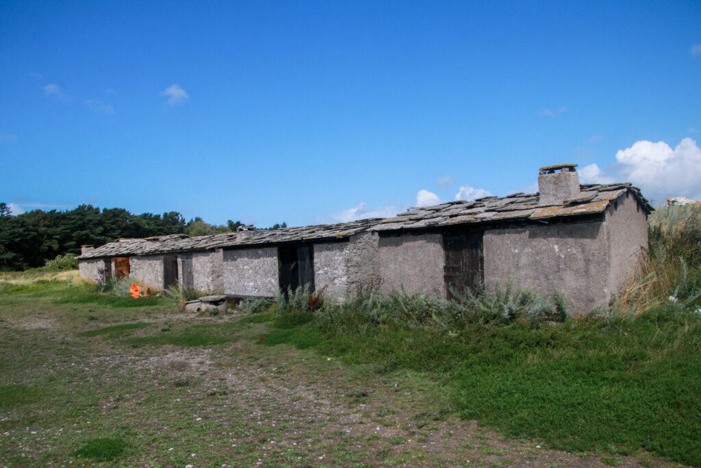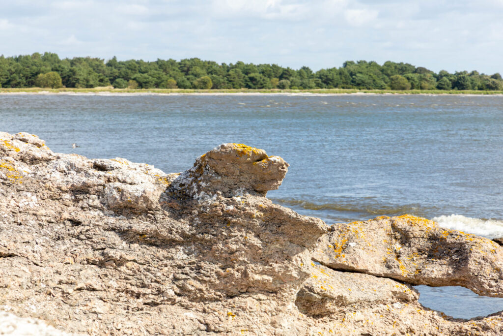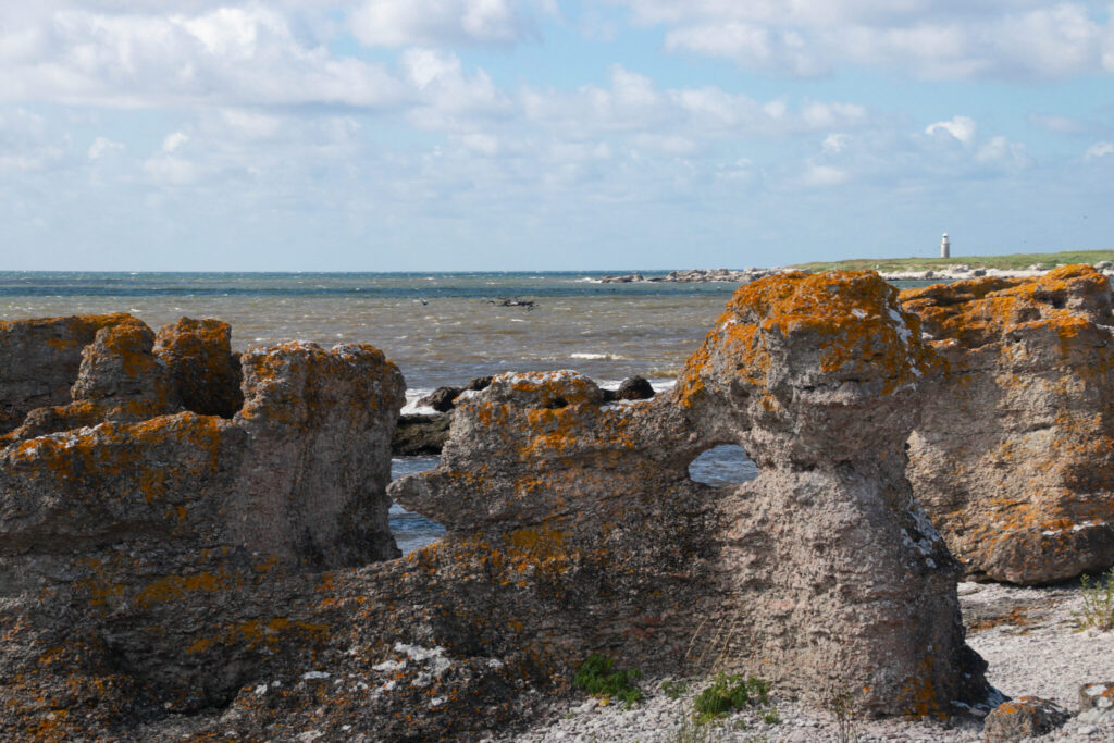 En morgon startar vi med en vandring. Vi börjar nere vid stranden naturligtvis. Vid Holms fiskeläge. Och följer grusvägen längs raukarna. Ett sjöodjur, en krokodil och en gubbe, hittar vi. I raukskepnad. Vinden tar i. Vi fäller upp våra huvor. Heligholmen med sin fyr där utanför.